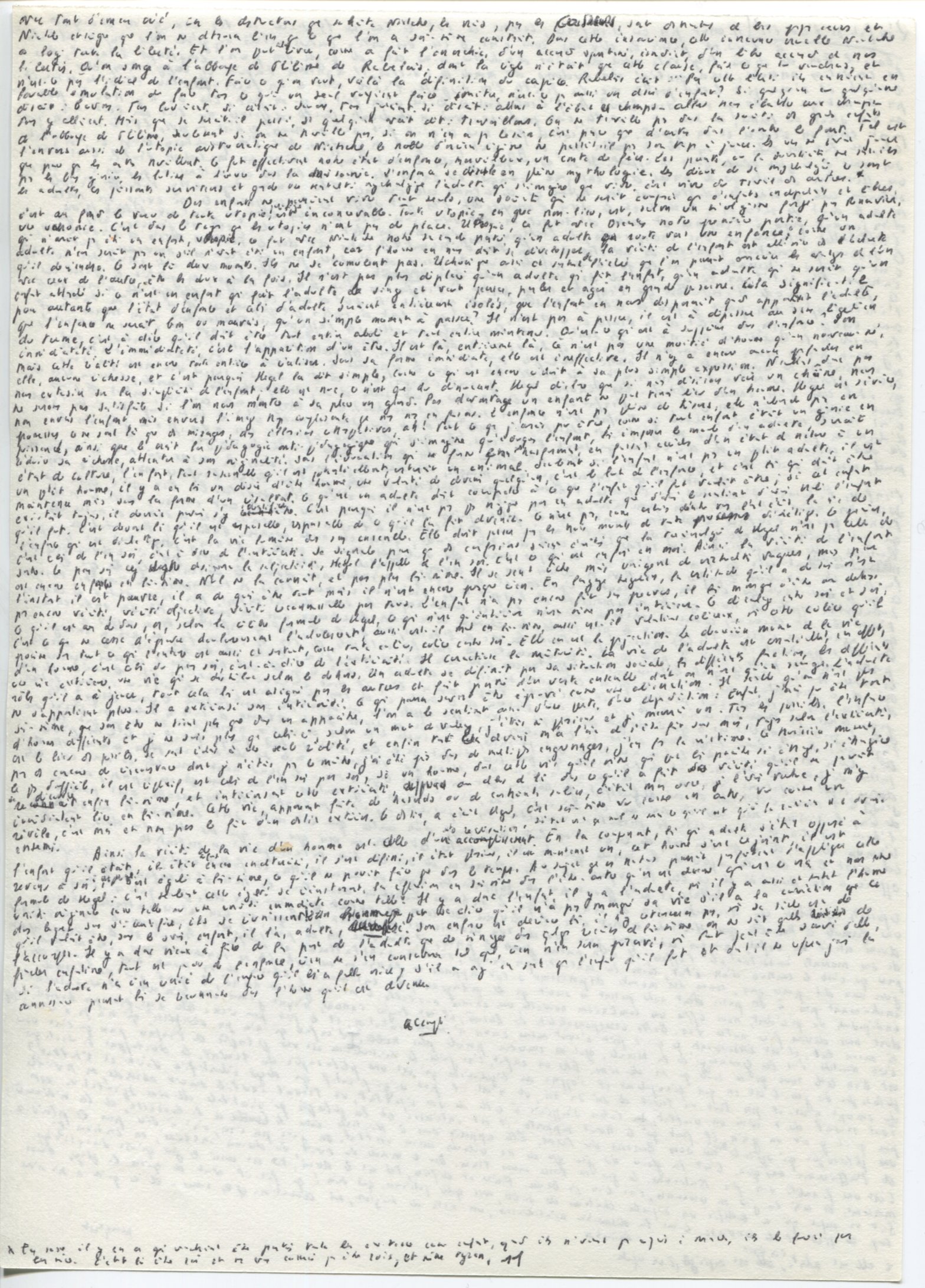 Des enfants ne pourraient vivre tout seuls, une société qui ne serait composée que d’enfants indépendants et libres – c’est au fond le vœu de toute utopie politique – est inconcevable. Toute utopie — en grec : non-lieu — est, selon un néologisme forgé par Renouvier, une uchronie. C’est dans le temps que les utopies n’ont pas de place. Uchronie — ce fut avec Descartes notre première partie — qu’un adulte qui n’aurait pas été un enfant ; uchronie – ce fut avec Nietzsche notre seconde partie – qu’un adulte en route vers une enfance ; comme un adulte n’en serait pas un s’il n’avait été un enfant, car l’homme en nous doit se développer, la vérité de l’enfant est elle-même dans l’adulte qu’il deviendra. Ce sont là deux moments. Ils ne se cumulent pas. Uchronique aussi et surtout donc l’idée que l’on pourrait concilier les avantages de l’un avec ceux de l’autre, être les deux à la fois. Il n’est pas plus déplacé qu’un adulte qui fait l’enfant, qu’un adulte qui ne serait qu’un enfant attardé, si ce n’est un enfant qui fait l’adulte, le singe et veut penser, parler et agir en grande personne. Cela signifie-t-il pour autant que l’état d’enfance et celui d’adulte seraient entièrement isolés, que l’enfant en nous disparaît quand apparaît l’adulte, que l’enfance ne serait, bon ou mauvais, qu’un simple moment à passer ? Il n’est pas à passer, il est à dépasser au sens hégélien du terme, c’est-à-dire qu’il doit être tout entier aboli et tout entier maintenu. Qu’est-ce qui est à supprimer dans l’enfance ? Son immédiateté. L’immédiateté, c’est l’apparition d’un être. Il est là, entièrement là, ce n’est pas une moitié d’homme qu’un nouveau-né, mais cette réalité est encore tout entière à réaliser. Sous sa forme immédiate, elle est ineffective. Il n’y a encore aucune profondeur en elle, aucune richesse, et c’est pourquoi Hegel la dit simple, comme ce qui est encore réduit à sa plus simple expression. N’allons donc pas nous extasier sur la simplicité de l’enfant ; elle est nue, ce n’est que du dénuement. Hegel déclare que si nous désirons voir un chêne, nous ne serons pas satisfaits si l’on nous montre à sa place un gland. Pas davantage un enfant ne peut tenir lieu d’un homme. Hegel est sévère, non envers l’enfant, mais envers l’image trop complaisante que nous nous en faisons. L’enfance n’est pas pleine de trésors, elle n’abonde pas en promesses, ce ne sont là que des mirages, des illusions rétrospectives. Ah ! tout ce que j’aurais pu être, comme si tout enfant était un génie en puissance, ainsi que le croit la pédagogie anti-pédagogique qui s’imagine qu’éduquer l’enfant, lui imposer le moule d’un adulte, serait réduire sa richesse, attenter à son originalité. Sans l’éducation qui nous forme en nous transformant, en faisant accéder d’un état de nature à un état de culture, l’enfant, tout raisonnable qu’il est potentiellement, resterait un animal. Seulement si l’enfant n’est pas un petit adulte, il est un petit homme, l’enfant, tout raisonnable qu’il est potentiellement, resterait un animal. Seulement si l’enfant n’est pas un petit adulte, il est un petit homme, il y a en lui un désir d’être homme, une volonté de devenir quelqu’un, c’est le but de l’enfance, et c’est lui qui doit être maintenu mais sous la forme d’un résultat. Ce qu’est un adulte doit correspondre à ce que l’enfant qu’il fut voulait être ; si cet enfant existait toujours, il devrait pouvoir s’y identifier. C’est pourquoi il n’est pas plus tragique pour un adulte que d’avoir le sentiment d’avoir trahi l’enfant qu’il fut. C’est devant lui qu’il est responsable, responsable de ce qu’il l’a fait devenir. Ce n’est pas, comme certains d’entre vous l’ont écrit, la vie de l’enfance qui est dialectique, c’est la vie humaine dans son ensemble. Elle doit passer par les trois moments de tout processus dialectique. Le premier, c’est celui de l’en-soi, c’est-à-dire de l’intériorité. Je signale, pour que des confusions soient évitées, que la terminologie de Hegel n’est pas celle de Sartre. Le pour-soi, chez Sartre, désigne la subjectivité, Hegel l’appelle de l’en-soi. C’est ce qui est enfoui en moi. Ainsi la vérité de l’enfant est encore enfouie en lui-même. Nul ne la connaît, et pas plus lui-même. Il se sent riche mais uniquement de virtualités vagues, mais pour l’instant il est pauvre, il a de quoi être tout mais il n’est encore presque rien. En langage hégélien, la certitude qu’il a de soi n’est pas encore vérité, vérité objective, vérité reconnaissable par tous. L’enfant n’a pas encore fait ses preuves, il lui manque d’être au-dehors ce qu’il est au-dedans, or, selon la célèbre formule de Hegel, ce qui n’est qu’intérieur n’est même pas intérieur. Ce décalage entre soi et soi, c’est ce que ne cesse d’éprouver douloureusement l’adolescent, aussi est-il mal en lui-même, aussi est-il volontiers coléreux, mais cette colère qu’il promène sur tout ce qui l’entoure, est aussi et surtout, comme toute colère, colère contre soi. Elle en est la projection. Le deuxième moment de la vie d’un homme, c’est celui du pour-soi, c’est-à-dire de l’extériorité. Il caractérise la maturité. La vie de l’adulte est essentiellement, en effet, une vie extérieure, une vie qui se distribue selon le dehors. Un adulte se définit par sa situation sociale, les différentes fonctions, les différents rôles qu’il a à jouer, tout cela lui est assigné par les autres et fait partie d’un vaste ensemble dont on n’est qu’un rouage. L’adulte ne s’appartient plus. Il a extériorisé son intériorité. Ce qui pourra souvent être éprouvé comme une aliénation. Il semble qu’on n’est 
